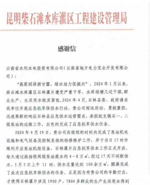 水投之干 | 昆明柴石滩灌区建管局致信感谢公司出色完成应急供水任务