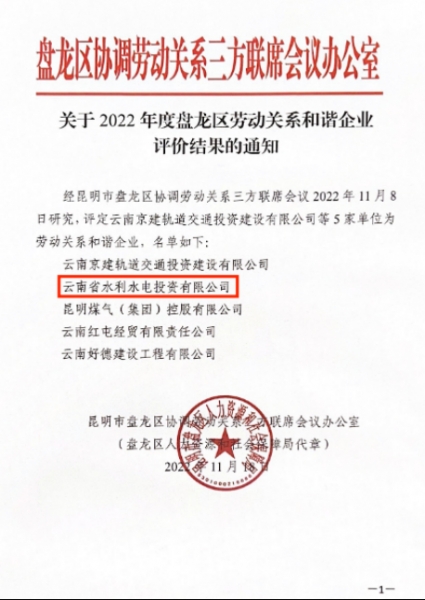 公司荣获盘龙区“2022年度劳动和谐企业”称号